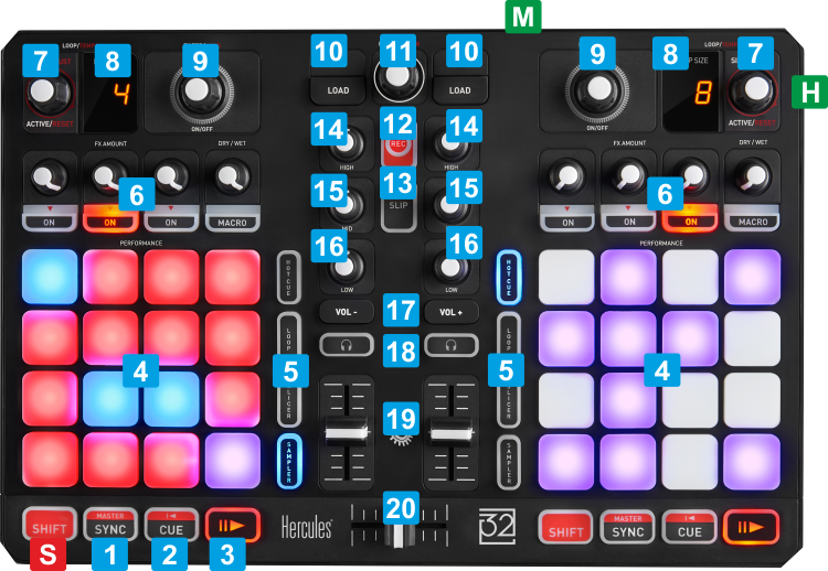 M MASTER OUTPUTConnect a pair of amplified speakers using standard RCA cablesH HEADPHONES SOCKETConnect your Headphones using a 1/4 " cable or adapterS SHIFTPress this button down to access secondary actions as described in the SHIFT ACTION column