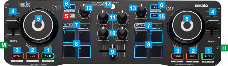 Jumps and stops to the Cue point when playing[Returns to the beginning of the track3 SYNCMatch BPM and Beat Phase with the opposite deckSmooth pitch reset. When pressed track will gradually get its original tempo4 TEMPOAdjust the tempo of the loaded track When in middle position , the track plays at its original speed.. 5 JOGWHEELTouch-sensitive jogwheel for scratching or bending (temporary speed up/down tempo) the track, depending on the Vinyl mode.Fast seek (search) track forward/backwards6 PFLUse these buttons to send the pre-fader audio signal of the Left/Right deck to the Headphones channel for pre-listening (connection at the right side).Control Headphones Mix. Use the left-side PFL button to toggle Headphones Mix between 100% and 0%. Use the right-side PFL button to toggle Headphones Mix between 50% and 0%.