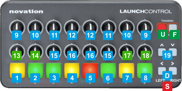 Blend the audio signal as above when in all other middle positions 18 BOTTOM KNOB 8Adjust the output Volume of the Headphones channel 19 LEFT/RIGHT ARROWDecrease/Increase Parameter 1 of the selected Pad PageDecrease/Increase Parameter 2 of the selected Pad Page When the