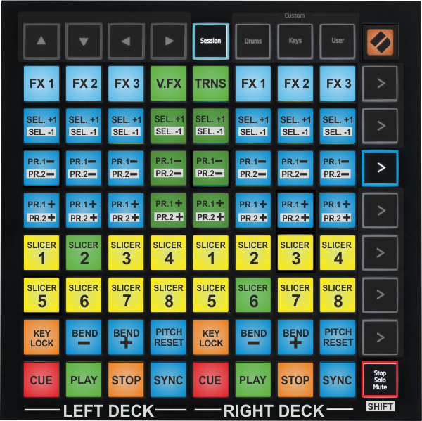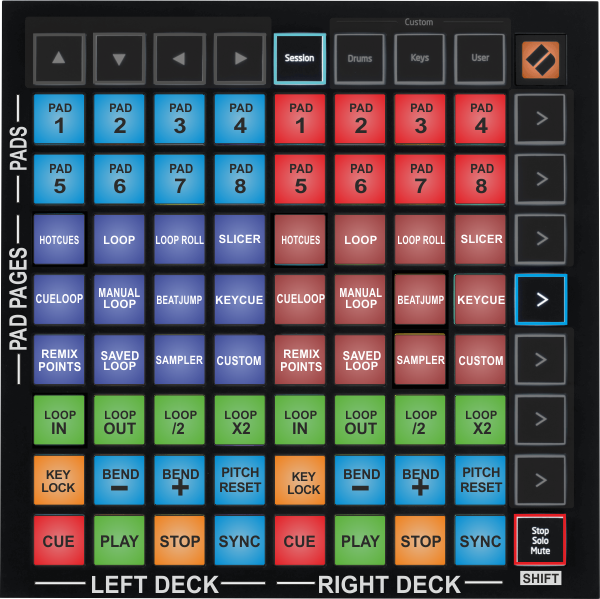 The Pads of the lower 3 rows offer Transport, Tempo and Loop controls for Left and Right decks, exactly like Pages 2 and 3,