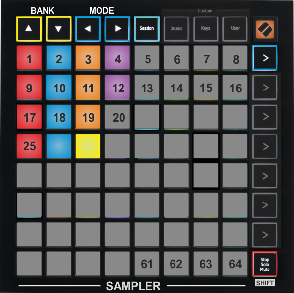 Use the first 4 top buttons to select the next/previous Sampler Bank and the next/previous Sampler Trigger mode (On/off, Stutter, Hold and Unmute)