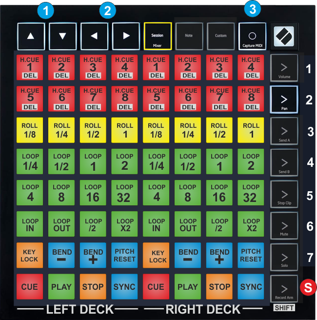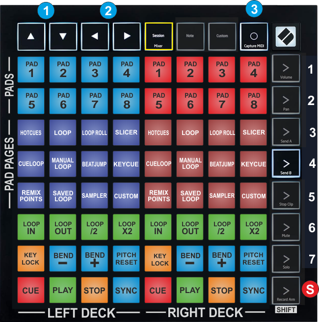 The Pads of the lower 3 rows offer Transport, Tempo and Loop controls for Left and Right decks, exactly like Pages 2 and 3,