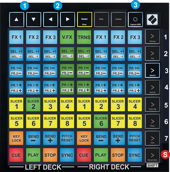 - LEFT/RIGHT ARROW: Use the left/right arrow button to get a list of the available Pad pages for the Left/Right Deck.