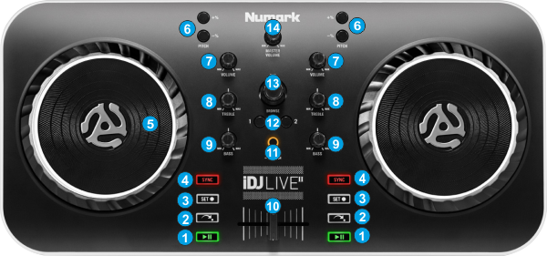 - CROSSFADER. Blends audio between the left and right decks.