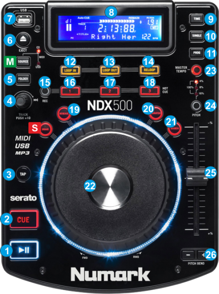 - M SOURCE. Use this button to cycle through the available Operation modes of the Numark NDX500 (CD, USB and MIDI).