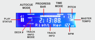 - LCD. The LCD screen will show all the Track’s and VirtualDJ Deck information, such as Elapsed/Remain/total times, BPM and pitch, Title, Artist and Album, Play status, assigned Deck number etc.