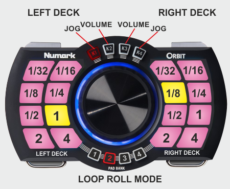 Each one of the 8 Pad triggers a momentary Loop Roll (while pressed) of a different length in beats as per the image below. When a Pad is released, the track will return to the position it would have been if the Loop Roll was never triggered.