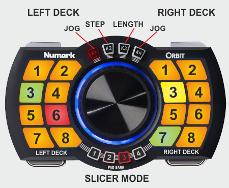 The 16 Pads of the Numark Orbit offer 7 different modes, depending on the 4 PAD BANK selection buttons. Press the same PAD BANK button again to access the additional mode