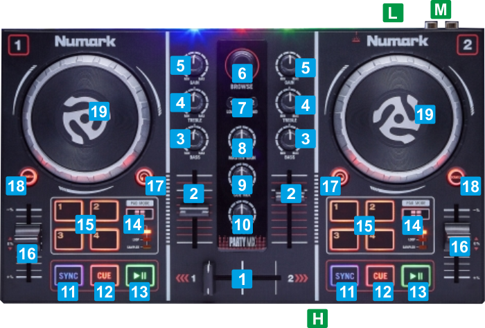 L LIGHTS MODEChange the Light Show mode. See Light ShowM MASTER OUTPUTConnect a pair of amplified speakers using a proper RCA cableH HEADPHONES SOCKETConnect your Headphones using a 1/8 " cable or adapter1 CROSSFADERBlends audio signals from left and right decks2 VOLUMEAdjust Volume Output for Left and Right deck3 BASSAdjust the Low (Bass) Equalizer Band4 TREBLEAdjust the High (Treble) and Mid Equalizer Band5 GAINAdjust the pre-fader Output Level6 BROWSEScroll through Folders or Tracks Push to toggle focus between Folders and Songs List. When in Folders list, push for more than 1 second to expand/collapse sub-folders7 LOADLoad the selected track to Left/Right deck. Hold for more than 1 second to unload the same deck8 MASTER GAINAdjust the Volume of the Master Output9 CUE MIXRoutes Master Output to the Headphones Channel when in maximum position. Routes decks (when PFL is enabled) to the Headphones Channel Blends Master Output and Decks (if PFL is enabled) in all other positions10 CUE GAINAdjust the Volume of the Headphones Output11 SYNCMatch BPM and Beat Phase with the opposite deck12 CUESets current position as Temporary Cue point. Preview track when paused while button is pressed Jumps and stops to the Cue point when playing13 PLAYPlay/Pause track14 PAD MODESCycles through the Pad modes (Hotcues, Loops, Sampler and Effects). See Pads15 PADS 1-4The 4 numbered Pads offer different functionality depending on the selected Pad mode. See Pads16 PITCHAdjust track's tempo (BPM)17 PFLSends pref-dader audio signal to the Headphones channel (for pre-listening)18 SCRATCHToggles between Scratch (Vinyl) and Bend (CD) mode for the Jogwheel19 JOGScratch (when Scratch mode is enabled) or Bend (when Bend mode is enabled)