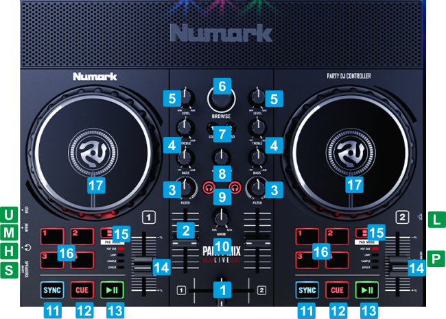 P ON/OFFPower on after all other connections are done.S SPEAKERSSet to On, if you wish to use the built-in speakers.U USBConnect the PartyMix Live with a USB port of your computer using the provided USB cableM MAINConnect a pair of amplified speakers using a proper 1/8" cableH HEADPHONES SOCKETConnect your Headphones using a 1/8 " cable or adapterL LIGHTS MODEChange the Light Show mode. See Light Show1 CROSSFADERBlends audio signals from left and right decks2 VOLUMEAdjust Volume Output for Left and Right deck3 FILTERApply the selected ColorFX (Filter by default) to the Left/Right Deck. No ColorFX is applied when knobs are in middle position4 2-BAND EQAdjust the High+Mid (Treble and Middle) and the Low (Bass) Equalizer Band5 LEVELAdjust the pre-fader Output Level (Gain) of each Left/Right Deck6 BROWSEScroll through Folders or Tracks Push to toggle focus between Folders and Songs List. When in Folders list, push for more than 1 second to expand/collapse sub-folders7 LOADLoad the selected track to Left/Right deck. Double-fast press to clone the Deck to the opposite one 8 HEADPHONE VOLAdjust the Volume of the Headphones Output9 CUE/PFLSends pre-fader audio signal to the Headphones channel (for pre-listening). Simultaneously press both to send both Decks to Headphones Output10 MASTER VOLAdjust the Volume of the Master Output11 SYNCMatch BPM and Beat Phase with the opposite deck12 CUESets current position as Temporary Cue point. Preview track when paused while button is pressed Jumps and stops to the Cue point when playing13 PLAYPlay/Pause track14 PITCHAdjust track's tempo (BPM)15 PAD MODESCycles through the Pad modes (Hotcues, Loops, Sampler and Effects). See Pads16 PADS 1-4The 4 numbered Pads offer different functionality depending on the selected Pad mode. See Pads17 JOGTouch-sensitive jogwheel to scratch (when Vinyl/Scratch mode is enabled) or Bend (when Bend mode is enabled). Selection of Vinyl/Bend mode is done via the GUI of VirtualDJ