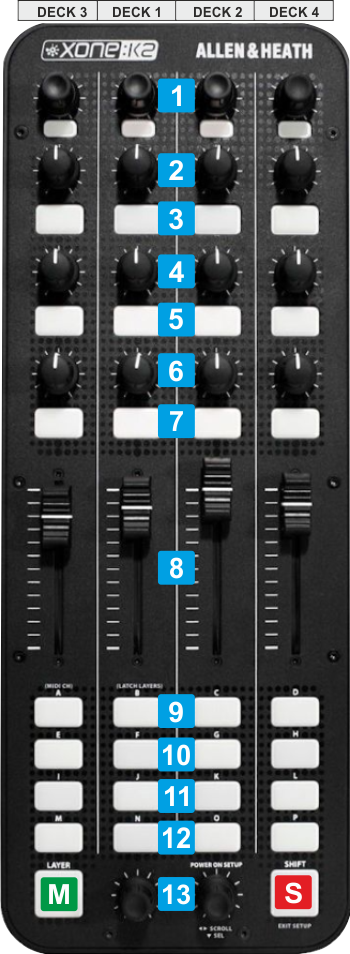 Advanced Setup ). The Deck/Channel order is 3-1-2-4 by default, but can be changed to 1-2-3-4 (See VirtualDJ Options->MixerOrder setting).