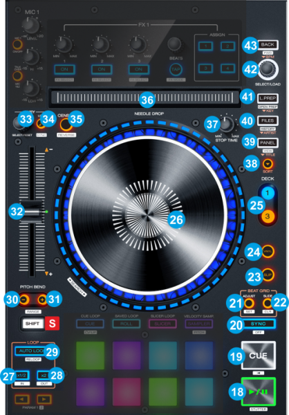 NEEDLE DROP. Touch-strip for track's search. For security reasons, the strip will not have any effect when the track is audible (track is playing and its Channel Fader is away from the minimum position). Hold SHIFT and then use the same touch-strip to navigate through the track regardless the track's playing/audible status.