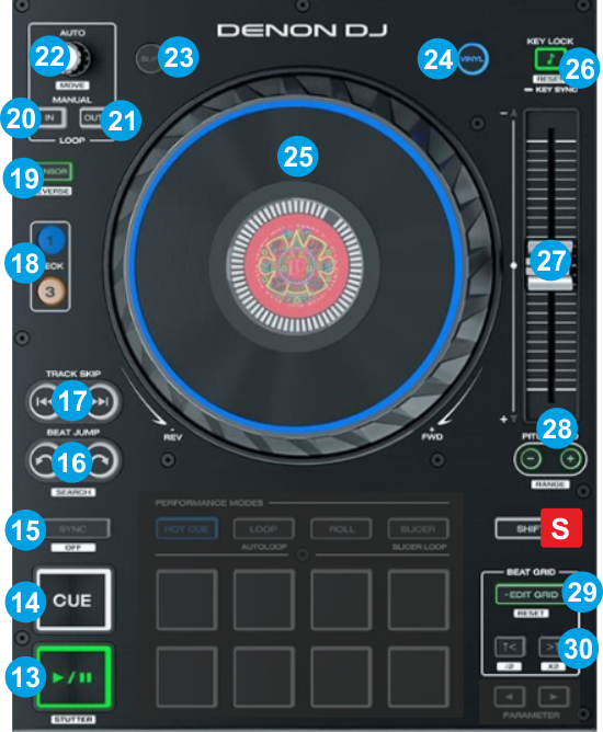 PLAY. Plays / Pauses the track. Hold SHIFT down and then press this button to "stutter-play" the track from the last set Cue Point.