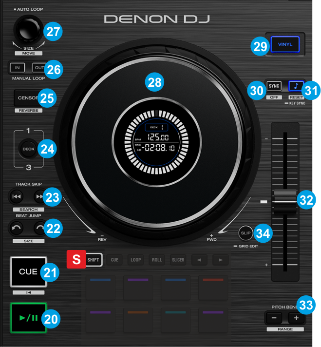 When Track is in Loop, hold SHIFT and then turn the encoder to move the loop backwards/forward by 1 beat - JOG. Touch sensitive jogwheel. Use the jogwheel to scratch (if Vinyl mode is selected) or pitch bend. The Jogwheel also offers Loop In and Loop Out point adjustment (see above Loop In/Out keys)