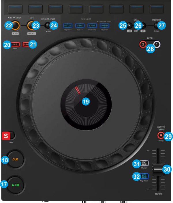 Hold SHIFT down and then press this button to return to the beginning of the track. - JOGWHEEL. Touch-sensitive jog-wheel for scratching (when in Vinyl Mode) , bending (when in CD Mode) or Loop In/Out fine-adjust.
