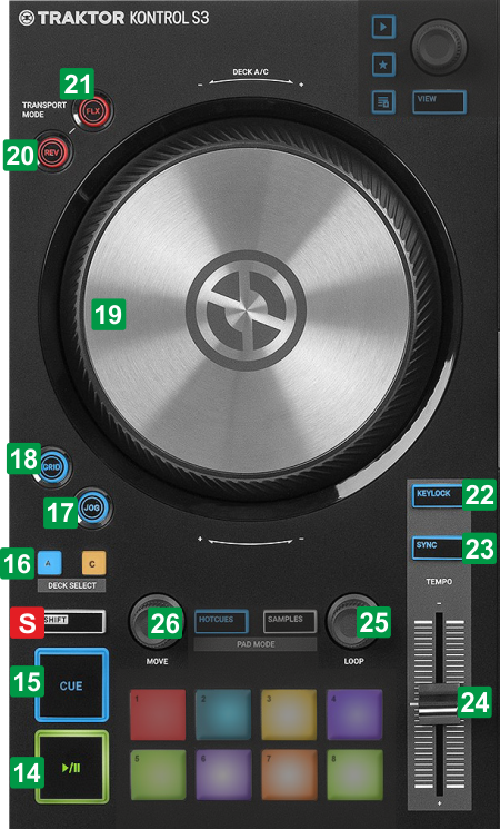14 PLAYPlay-pause left/right assigned DeckPlays-stutter left/right Deck from last paused position15 CUEWhen Deck is paused, sets a temporary Cue point and plays from that position while pressed.When playing, returns and stops to the previously set temporary CueStops at the beginning of the track16 DECK SELECTSelect Deck A / Deck C as Left Deck or Deck B/ Deck D as Right Deck.17 JOG MODEToggle between Vinyl (led lit) and CD (led dimmed) modes. 18 GRID MODESets jogwheel to Grid modewhile pressed. Re-analyze BPM and beatgrid (undo Grid manual adjusts)19 JOGWHEELTouch-sensitive jogwheel to scratch, bend or adjust Beat grid. When Vinyl mode is enabled, use the upper part of jogwheel to hold and scratch and the outer part to pitch-bend. When Grid mode is enabled use the jogwheel to move the Beat-Grid in time. Fast seek/search trough track20 REVWhen enabled, track will be playing in reverse and when disabled, track will resume playing forward from current position. If Slip mode is enabled, track will be playing in reverse while the button is held down and when released, will resume playing forward from the position the track would have been if the reverse was never triggered.21 FLXEnable/disable Slip mode. When enabled, several actions such as Loops, Hotcues, scratching, reverse etc, will act temporary and when action is done, track will resume playing from the.position it would have been if the action was never triggered22 KEYLOCKEnable/disable Key-Lock (Master Tempo). When enabled, track will retain its Key when Tempo is alteredSelect next available %range for the Pitch slider23 SYNCPress to match BPM and phase to the opposite deck (or Master-Deck if more than 2 are used)Smoothly resets tempo to its original value24 TEMPOAdjust the Tempo of the playing track. When at middle position, track will be playing at its original tempo.25 LOOPHalves/doubles the size of the Loop Push: Auto Loop. Press to enable/disable an Auto-Loop of the selected size in beats Adjust the 2nd Parameter of the selected Pads page. Push: No action26 MOVEWhen Loop is enabled, turn to move the loop backwards/forward in time by 1 beat per click. Push: Reloop/Exit. Press to trigger the last enabled Loop. If in Loop, exit the LoopAdjust the 1st Parameter of the selected Pads page. Push: No action