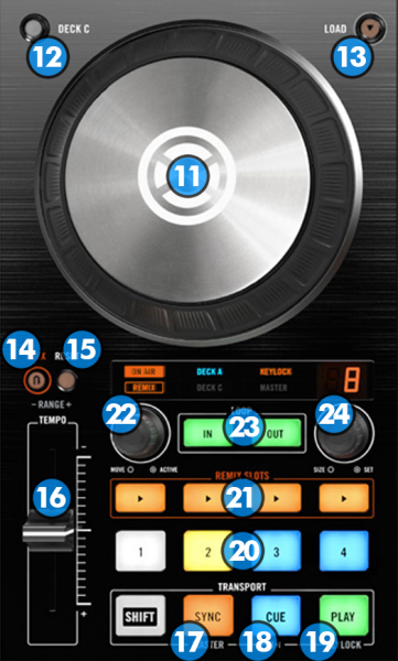JOG: Touch sensitive jogwheel. Use the jogwheel to scratch or bend (depending on the Vinyl/Scratch mode selection) or fast seek through the track if the Search mode is enabled. The Jogwheel also offers Loop In and Loop Out point adjustment (see Loop Controls)
