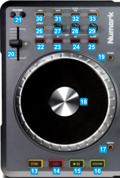 13 SYNCMatch BPM and Phase with the opposite deck14 CUESets a Temporary Cue when paused and previews track from Cue while pressed Jumps track to Cue point when playing15 PLAYPlay-pauses deck 16 STUTTERPlays track when paused. Jumps and continues playing from the CUE point when playing 17 SCRATCHToggles between the Scratch (Vinyl) and Bend (CD) modes for the Jogwheel18 JOGTouch-sensitive jogwheel for scratch or bend depending on the selected mode19 KEYLOCKEnable/disable Key-Lock (Master Tempo). When enabled, Key will remain unchanged on Tempo changes20 PITCHAdjust track's tempo21 PITCH BENDTemporary slow-down/speed-up track's speed. Tempo will be resumed to the value designated by the pitch fader, once the buttons are released22 LOOP MODEToggle between Auto and Manual loop mode23 LOOP INManual Loop mode : Set a Loop In (Start) point for a manual loop Auto Loop mode : Half the size of the Loop24 LOOP OUTManual Loop mode : Set a Loop Out (End) point for a manual loop. Exits Loop when Loop is enabled. Auto Loop mode : Enable/disable an auto Loop of a selected size in beats25 RELOOPManual Loop mode : Enables the last triggered loop. Exits Loop when loop is enabled Auto Loop mode : Double the size of the Loop26 EFFECT ONTurn the selected Efect on/off27 EFFECT SELECTSelects previous/next Effect28 EFFECT CONTROL 1Adjusts the 1st Parameter of the selected Effect29 EFFECT CONTROL 2Adjusts the 2nd Parameter of the selected Effect30 DELETEturn the Hotcues Delete mode on/off31 BUT 1Assign or trigger (if assigned) Hotcue 1 Delete mode : Deletes Hotcue 132 BUT 2Assign or trigger (if assigned) Hotcue 2 Delete mode : Deletes Hotcue 233 BUT 3Assign or trigger (if assigned) Hotcue 3 Delete mode : Deletes Hotcue 3