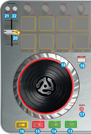 - SCRATCH. Press this button to set the Jogwheel to Vinyl (Scratch) or CD (Bend) mode. In Vinyl mode, use the outer part of the Jogwheel to bend (temporary speed up – slow down the tempo of the track).