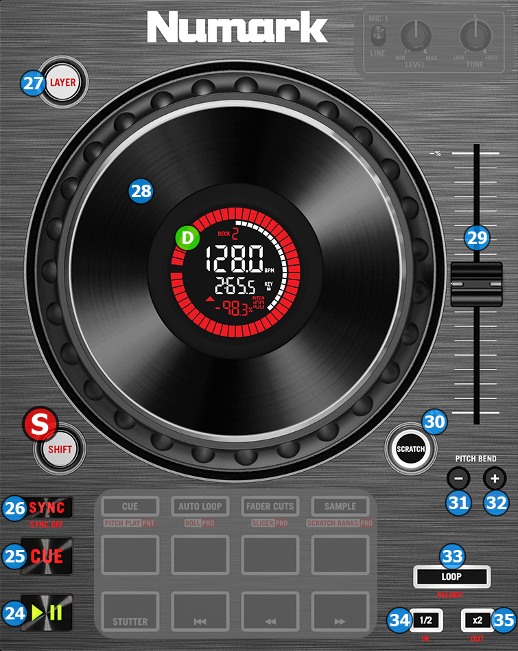In Loop In/Out Adjust modes , use the jogwheel to fine-adjust the Loop In (Start) / Loop Out (End) points of a manual loop.Fast search (seek) through track's time29 PITCHAdjust Deck's tempo (BPM)30 SCRATCHToggle between Scratch (Vinyl) and Bend (CD) modes for the Jogwheel31 PITCH BEND - Temporary slow-down deck's tempo. Tempo will return to the value designated by the Pitch fader, once the button is releasedSelect the next available -/+ % range for the Pitch fader 32 PITCH BEND + Temporary speed-up deck's tempo. Tempo will return to the value designated by the Pitch fader, once the button is releasedEnable/disable Key-Lock (Master Tempo). When enabled, the key of the track will retain its value when the Pitch/Tempo is changed.33 LOOP Triggers a Loop of the selected size in beats.Enables the last triggered loop (reloop)34 LOOP 1/2 Halves the length of the loop.Set the Entry point of a Loop (Loop-In position). When in loop, sets Jogwheel to Loop-In Adjust mode35 LOOP x2 Doubles the length of the loop.Set the Exit point of a Loop (Loop-Out position). When in loop, sets Jogwheel to Loop-Out Adjust mode
