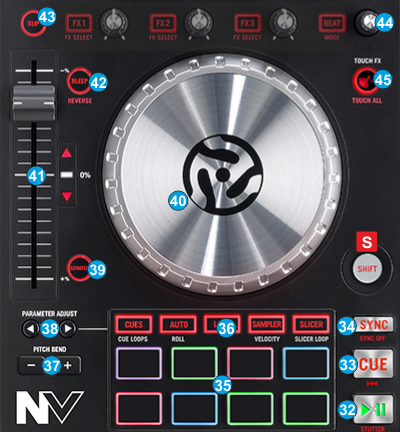 The Jogwheel also offers Loop In and Loop Out point adjustment (see Manual Loop Pads mode) - PITCH. Adjust the track's playback speed (tempo). The white LED next to the fader will light up when the unit’s fader is set at 0%. The Red Up and Down Arrow LEDs will lit if the pitch position of the unit and the actual pitch of the software do not match, to indicate the direction you need to move the hardware fader in order to catch the software one.