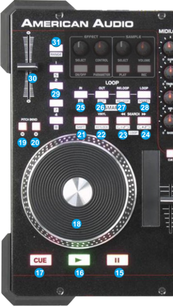 - PAUSE. This button operates depending on the selected Stop Button behavior (setting available in Deck Options in the default VirtualDJ GUI). By default, press this button to pause the track if playing. If the track is paused, press this button to cycle though the available stored Cues.