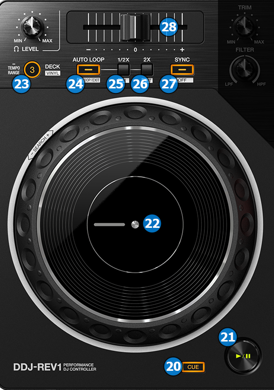 JOGWHEEL. Touch sensitive platter for scratching (Vinyl Mode) or bending (CD Mode). Press and hold SHIFT and then turn the jog to seek fast inside the track (jog search)