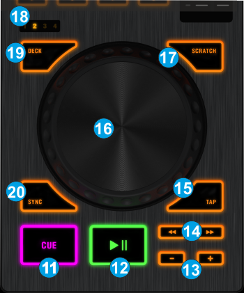- DECK: Use this button to assign a software deck to this unit. The Leds above the button indicate which deck is selected. A single unit is capable to control all 4 decks.