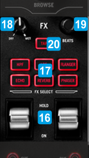 16 FX ON/HOLDTriggers the selected Effect. Move the paddle triggers up (for toggle) or down for momentary. No Effect is applied when at middle position. 17 FX SELECTSelect an Effect for both Left/Right Decks. Pre-defined Effects are High-Pass Filter, Low-Pass Filter, Flanger, Echo,Reverb and Phaser. Led will blink when the Effect is enabled on any of the Left/Right decks. Only one Effect can be selected each time. 18 FX DRY/WETAdjust the 1st Parameter - usually the Strength - of the selected Effect on both Left/Right Decks.19 FX BEATSAdjust the 2nd Parameter - usually the Beats - of the selected Effect on both Left/Right Decks.20 TAPWhen track is paused, set current position as 1st beat of the Beat-grid, or tap beat when track is playing to manually adjust Track's BPM.Re-analyze track for BPM and Key