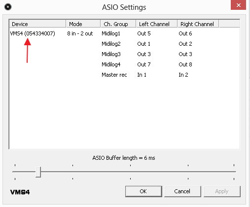 Pre EQ mode the ASIO Driver will list the VMS4 device number, the first number in the sequence will be a "0" (see image below)