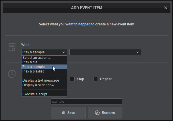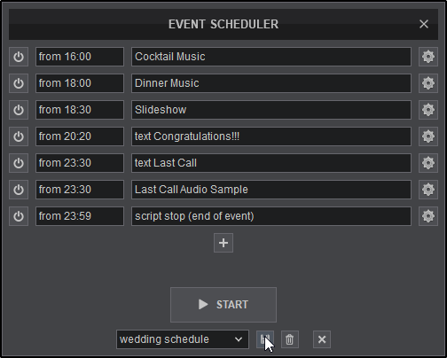 The Event Scheduler provides an easy to use interface that will automate VirtualDJ functions in sequential order based on time. This feature is used to automatically start and or/stop predetermined events such as playing a playlist or sample, adding text or a slideshow to the screen, or even using VDJScript for more complex event actions.