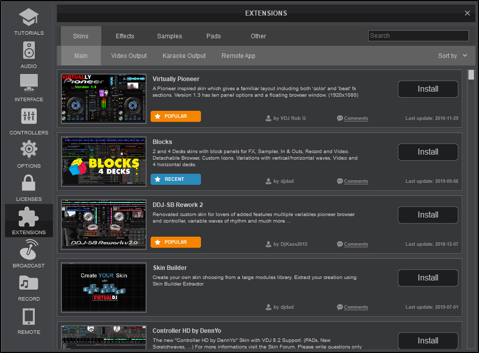 Extensions allow you to add Skins, Effects, Samples and other addons directly from inside the software interface. This allows you to keep focussed on what you are doing as well as find new and cool addons created by the VirtualDJ community.