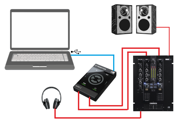 - Connect the PHONES Output of the Traktor Audio 2 MKII to another Input Channel of the analog mixer, 1/8" male to 2xRCA male cables