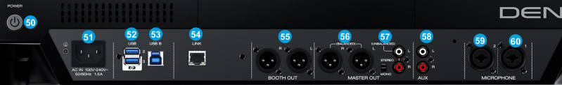 - BOOTH OUT (XLR): Use XLR cables to connect this output to a booth monitoring system. The level of this output is controlled by the Booth Level knob on the top panel.