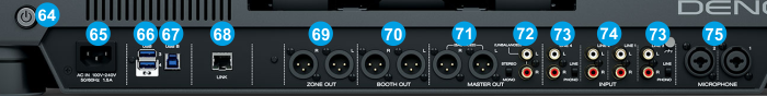 - BOOTH OUT (XLR): Use XLR cables to connect this output to a booth monitoring system. The level of this output is controlled by the Booth section on the top panel.