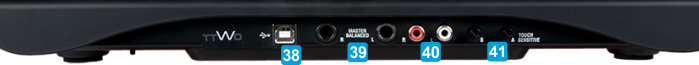 38 USBConnect the unit to a USB port of your computer using the provided USB cable39 MASTER OUT TRSConnect your amplifier (speakers) to this balanced Output using TRS 1/4" cables. The level of this output is controlled by the Master knob at the top panel of the unit40 MASTER OUT RCAConnect your amplifier (speakers) to this unbalanced Output using standard RCA cables. The level of this output is controlled by the Master knob at the top panel of the unit41 TOUCH SENSORAdjust the touch sensitivity of the Left/Right Jogwheel