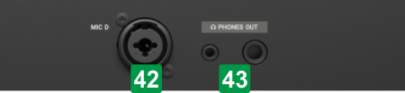 42 MIC D Use this connector to connect your microphone . The signal of this input will be routed to the Input of the USB Audio Interface if the MIC D led at the top panel is lit (via SHIFT+EXT) and can be routed to Deck D via the EXT button.43 PHONES 1/4" 1/8" Use these connectors to connect your Headphones.The level of this Output is controlled from the Headphones VOL knob at the top panel.