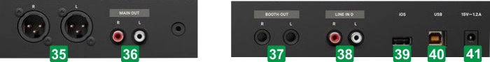 35 MASTER OUT - XLR Use these connectors to connect your device on a PRO grade amplifier or self-powered (active) speakers. The level of this output is controlled from the MASTER knob at the top panel.36 MASTER OUT - RCA Use these connectors to connect your device on another mixer or consumer grade amplifier. The level of this output is controlled from the MASTER knob at the top panel37 BOOTH OUT - TRS Use these connectors to connect your device on a secondary amplifier or self-powered (active) speakers for booth monitoring. The level of this output is controlled from the BOOTH knob at the top panel38 LINE IN D Use these connectors to connect a line-level signal equipment.The signal of this input will be routed to the Input of the USB Audio Interface if the LINE led at the top panel is lit (via SHIFT+EXT) and can be routed to Deck D via the EXT button.39 IOS Not used from VirtualDJ40 USBUse a standard USB cable to connect Kontrol S3 with your computer.41 DC INConnect the provided power supply unit. Make sure all other connections are done before connecting to power.