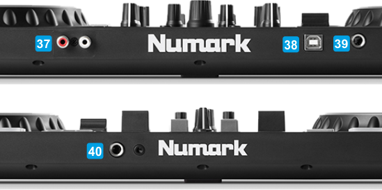 37 MASTER OUTPUTConnect your amplified speakers using proper RCA cables. The Level of this Output is controlled from the top panel of the unit38 USBConnect the Mixtrack Pro FX with a USB port of your computer, using the provided USB cable39 MIC SOCKETConnect a Microphone * using a 1/4" cable or adapter. The Level of this Input is controlled from the top panel of the unit[40 HEADPHONES SOCKETConnect your Headphones using a 1/4" or/and a 1/8" cable or adapter. The Volume of the Headphones channel is controlled from the top panel of the unit