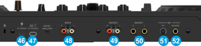 - BOOTH OUT: Booth signal output (RCA Un-Balanced). The strength of the signal is controlled by “BOOTH LEVEL” knob (9) on the top panel mixer section. Use it to connect your booth speakers, or an amp that needs different sound output level than master output.