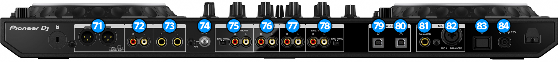 CH4 INPUTS: Connect an analog source on CH4 of the DDJ-1000 mixer. You can connect a turntable or a CD-Player. The input is selectable via “INPUT SELECT SWITCH” (11) on the mixer section