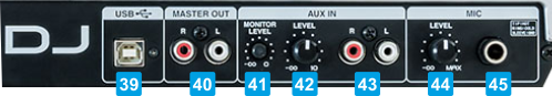 39 USBConnect this port with a USB port of your computer using the provided cable40 MASTER OUTConnect your amplified speakers using proper RCA cables. The Level of this output is controlled from the top panel of the unit41 MONITOR LEVELAdjust the Volume of the AUX audio signal sent to the Headphones Channel42 AUX IN LEVELAdjust the Level of the Auxiliary Input43 AUX INConnect an auxiliary media source such as CD Player, MP3 player etc to this socket, using proper RCA cables. The audio signal of this Input is directly routed to the Master Output Channel (not offered in the USB Audio Interface so cannot be included in the Audio Setup nor can be recorded)44 MIC LEVELAdjust the Output Level of the Microphone Input45 MIC INPUTConnect a Microphone using a 1/4" cable/adapter. The audio signal of this Input is directly routed to the Master Output (not offered in the USB Audio Interface so cannot be included in the Audio Setup nor can be recorded)46 HEADPHONES SOCKETConnect your Headphones using a 1/4" cable/adapter. The Output Level of this Output is controlled from the top panel of the unit