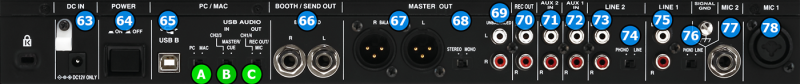 4. BOOTH OUT: Booth signal output (TRS – Balanced). The strength of the signal is controlled by “BOOTH/SEND LEVEL” knob (28) on the mixer section. Use it to connect your booth speakers, or an amp that needs different sound output level than master output.