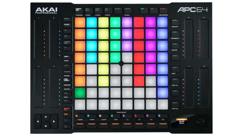 The 64 velocity-sensitive pads on the AKAI Professional APC64, which are arranged in an 8x8 matrix and provide visual feedback courtesy of their RGB colour backlighting, can be used to control VirtualDJ Sampler, Pads and many more. The eight touch strips in turn allow the user to adjust various Effect parameters and Visual feedback is provided here via the OLED display at the bottom right of the user interface.