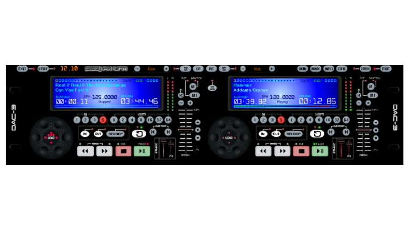 The PCDJ DAC-3 is a control surface with a USB connector for use with mixing software. The DAC-3 resembles a controller of a DJ CD player with all the familiar controls recognized by beginner and seasoned DJs alike. Two large wheel controls establish realtime scratch and cuing of audio files, pitch sliders are provided and an arsenal of buttons and switched are mapped to deliver full control over DJ software.