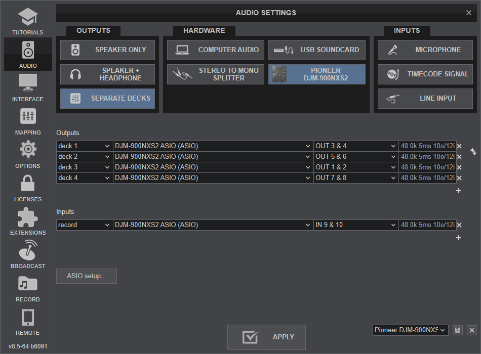 DJM-900NXS2 has a pre-defined Audio setup and a special button in the AUDIO tab of Config to provide that. Alternative Audio setups can be applied in the same window.
