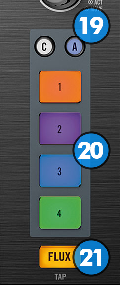 - HOTCUE BANK SELECT: Press these buttons to select the active hotcue bank for each deck. Buttons A & B select bank 1 for decks 1 & 2 respectively while buttons C & D select bank 2. When bank 1 is selected the hotcue buttons (20) act against hotcues 1-4, while when bank 2 is selected they act against hotcues 5-8.