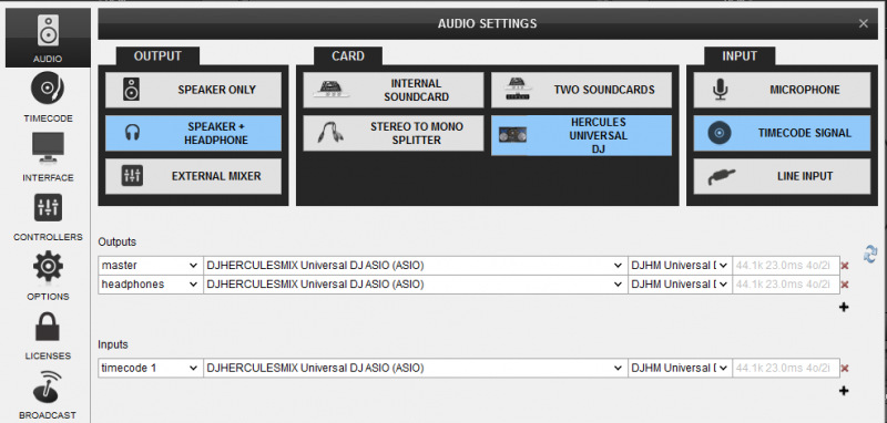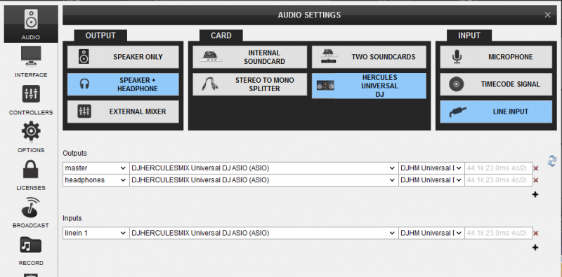 The Hercules Universal DJ is offering a built-in audio interface with 2 stereo Outputs and 1 stereo Input (AUX). The Outputs are already pre-defined and offered by the special button in the AUDIO tab of VirtualDJ Config for Master (Channels 1,2) and Headphones (Channels 3,4).
