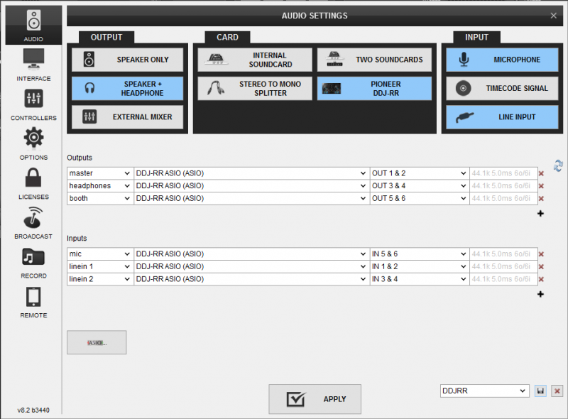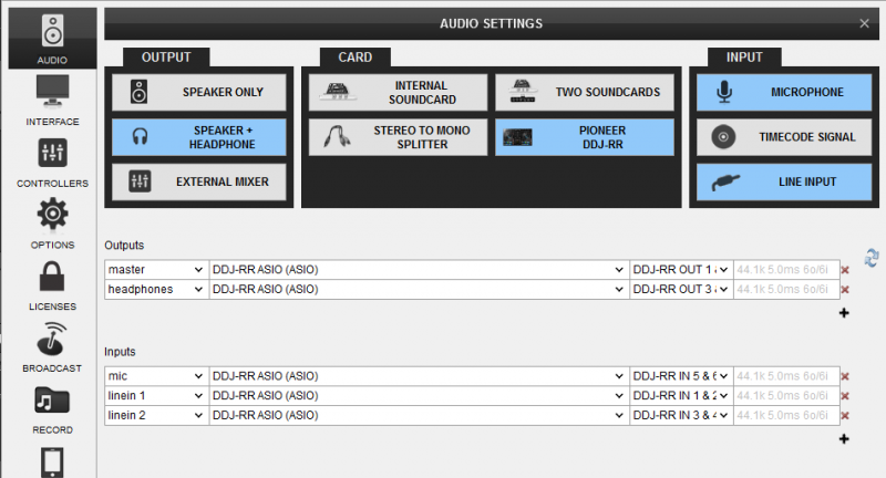 The Pioneer DDJ-RR has a dedicated Channel for the Booth Output, which is not part of the pre-defined audio configuration. In case you need to use the Booth Output, you will need to manually add a Booth line in the audio setup as shown in the image below