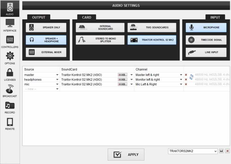 The unit has a pre-defined Audio setup and a special button in the AUDIO tab of Config to provide that. Alternative Audio setups can be applied in the same window.